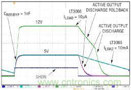 LT3065 有一個 10mA 負載,LT3066 僅由設定輸出電壓 (本例中為 10μA) 的電阻器分壓器加載。即使給 LT3066 的輸出加上了很輕的負載,由於該器件提供主動輸出放電功能,所以輸出電壓也會快速放電。相比之下,LT3065 的輸出電容器僅由連至其上的 10mA 負載放電,放電速度慢得多。