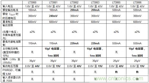 表 1:LT306x 係列 LDO 功能和特點一覽