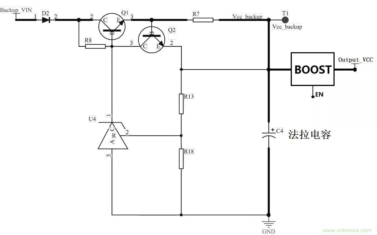 若對電壓高於法拉電容本身電壓上限的電源係統提供掉電續航時,Vcc_backup端需通過BOOST升壓電路後以實現,且注意係統正常時(充電過程中)關斷EN腳。