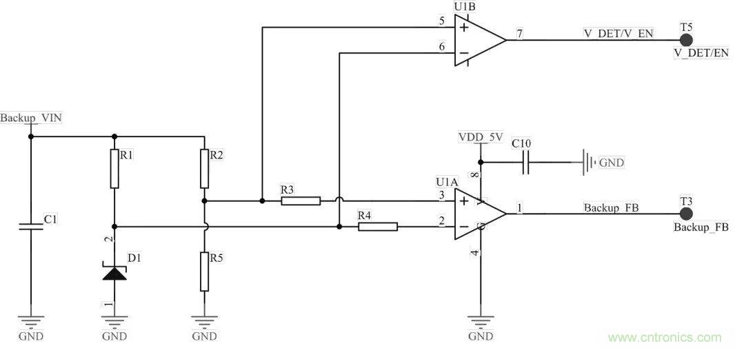 此外係統掉電情況需要掉電檢測電路實現。使用一顆比較器器件即可,注意使用Output_VCC端(duan)供(gong)電(dian),以(yi)確(que)保(bao)外(wai)部(bu)掉(diao)電(dian)時(shi),比(bi)較(jiao)器(qi)仍(reng)然(ran)可(ke)以(yi)工(gong)作(zuo)。比(bi)較(jiao)器(qi)負(fu)端(duan)連(lian)接(jie)一(yi)個(ge)參(can)考(kao)電(dian)壓(ya),參(can)考(kao)電(dian)壓(ya)由(you)穩(wen)壓(ya)二(er)極(ji)管(guan)提(ti)供(gong)。正(zheng)常(chang)供(gong)電(dian)時(shi),比(bi)較(jiao)器(qi)輸(shu)出(chu)電(dian)壓(ya)由(you)升(sheng)壓(ya)電(dian)路(lu)的(de)反(fan)饋(kui)端(duan)分(fen)壓(ya)決(jue)定(ding);掉電時,比較器輸出低電平,此時處理器仍未掉電,收到狀態信息可及時響應處理。另一路掉電檢測可供其它功能使用。