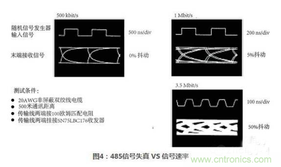 確定隨機噪聲、抖動、失真等對信號影響程度的最簡單方法是使用眼圖。圖4顯示使用20AWG雙絞線電纜500米處、不同信號速率下,接收端的信號失真情況。當信號速率進一步增加,抖動的影響變得更加顯著。在1Mbit/s時,抖動大約為5%,而在3.5Mbit/s時,信號開始徹底被淹沒,傳輸質量嚴重降級。在實際係統中,可允許的最大抖動一般要小於5%。