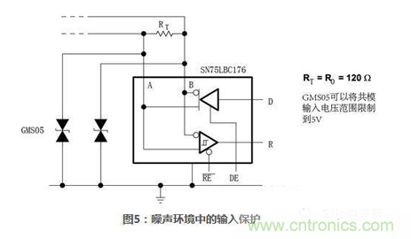 電(dian)流(liu)隔(ge)離(li)能(neng)夠(gou)提(ti)供(gong)更(geng)好(hao)的(de)係(xi)統(tong)級(ji)保(bao)護(hu),但(dan)是(shi)價(jia)格(ge)也(ye)更(geng)高(gao)。更(geng)流(liu)行(xing)並(bing)且(qie)比(bi)較(jiao)便(bian)宜(yi)的(de)方(fang)案(an)是(shi)使(shi)用(yong)二(er)極(ji)管(guan)保(bao)護(hu)。使(shi)用(yong)二(er)極(ji)管(guan)方(fang)法(fa)代(dai)替(ti)電(dian)流(liu)隔(ge)離(li)是(shi)一(yi)種(zhong)折(zhe)衷(zhong)方(fang)法(fa),在(zai)更(geng)低(di)層(ceng)次(ci)上(shang)提(ti)供(gong)保(bao)護(hu)。外(wai)接(jie)二(er)極(ji)管(guan)和(he)內(nei)部(bu)集(ji)成(cheng)瞬(shun)態(tai)保(bao)護(hu)二(er)極(ji)管(guan)的(de)例(li)子(zi)如(ru)下(xia)圖(tu)所(suo)示(shi):圖5所示485收發器SN75LBC176外接二極管來防止瞬態毛刺。