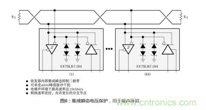 圖6所示內部集成瞬態抑製二極管的485收發器SN75LBC184,用於既希望使用完整485功能,PCB空間又受限的場合。SN75LBC184在內部集成了保護二極管,針對高能量電氣噪聲環境,可直接替換SN75LBC176。