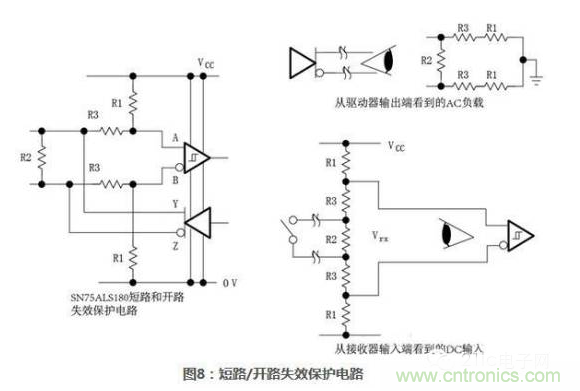 使用這樣的內部上下拉電阻允許總線不進行終端匹配,但是會顯著的降低最大信號速率和可靠性。圖7給出了一些485接口通用外置失效保護電路,每個電路都盡力維持接收器輸入端電壓不小於最小臨界值並在一個或多個故障條件(開路、空閑、短路)下,維持一個已知的邏輯狀態。