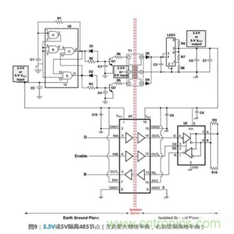 此外,使用低功耗計數,可以使用小型隔離變壓器。如圖9所示,收發器使用SN65HVD10,當然任何TI公司3.3V或5V RS485收發器、3.3-V TIA/EIA-644 LVDS或者3.3-V TIA/EIA-899 M-LVDS收發器都可以使用這個電路。2.4.2操作原理圖9所示的例子可用於3.3V或5V,電源使用變壓器隔離,數據信號采用數字隔離器隔離。因為485收發器需要隔離電源,可調LDO穩壓器必須被隔離。