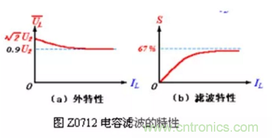 4. 電容濾波電路的外特性(指UL與IL之間的關係)和脈動特性(指S與IL 之間的關係)比較差,如圖Z0712 所示。可以看出輸出電壓UL和脈動係數S隨著輸出電流IL 的變化而變化。當IL=0(即RL= ∞ )時,UL = U2(電容充電到最大值後不再放電),S = 0。當IL增大(即RL減小)時,由於電容放電程度加快而使UL下降,UL 的變化範圍在 U2 ~0.9 U2之間(指全波或橋式),S變大。所以,電容濾波一般適用於負載電流變化不大的場合。