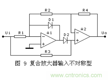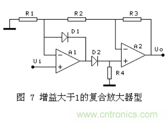 圖7,8,9三種電路,當運放A1輸出為正時,A1的負反饋是通過二極管D2和運放A2構成的複合放大器構成的,由於兩個運放的複合(乘積)作用,可能環路的增益太高,容易產生振蕩。