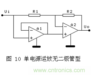 圖10是利用單電源運放的跟隨器的特性設計的,單電源的跟隨器,當輸入信號大於0時,輸出為跟隨器;當輸入信號小於0的時候,輸出為0.使用時要小心單電源運放在信號很小時的非線性.而且,單電源跟隨器在負信號輸入時也有非線性。