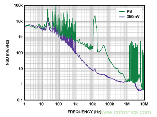 當裕量為 350 mV 時,LDO 采用壓差工作模式。此時,LDO 再也不能調節輸出電壓,充當一個電阻,輸出噪聲升至近 76 μVrms,如圖 9 所示。隻有 FET 的 RDSON和輸出端的電容形成的極點衰減輸入噪聲。