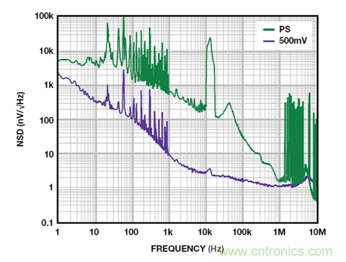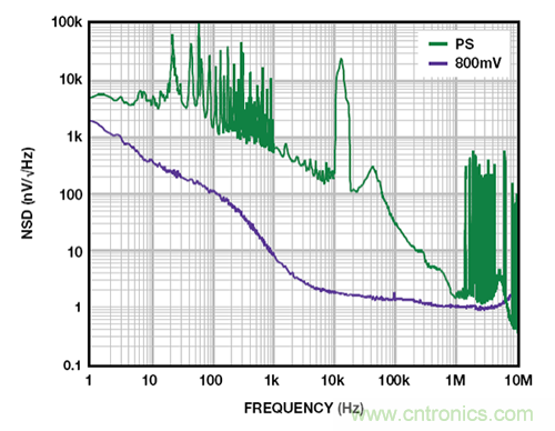 如 ADM7150 超低噪聲、高 PSRR 調節器一類的新型 LDO 實際上級聯了兩個 LDO,因此,結果得到的 PSRR 約為各個級之和。這些 LDO 要求略高的裕量電壓,但能夠在 1 MHz 條件下實現超過 60 dB 的 PSRR,較低頻率下,PSRR 可以遠超 100 dB。圖 7 所示為一個 5 V 的 ADM7150 的噪聲頻譜密度,其負載電流為 500 mA,裕量為 800 mV。10 Hz 至 100 kHz 範圍內,輸出噪聲為 2.2 μV rms。隨著裕量降至 600 mV,整流諧波開始顯現,但當輸出噪聲升至 2.3 μV rms 時,其對噪聲的影響很小。