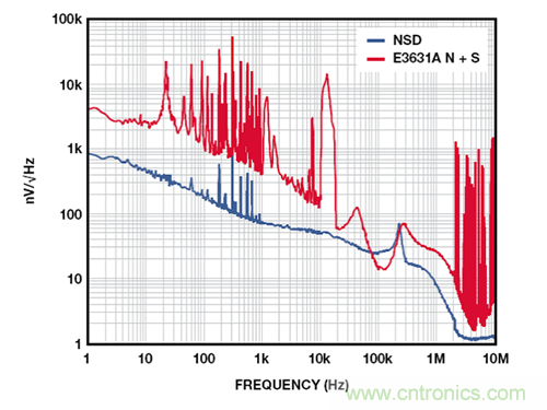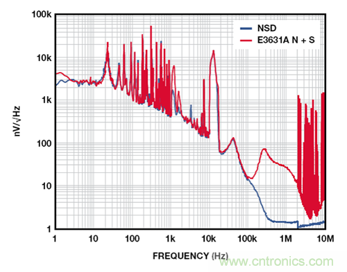 圖 4 展示的是 2.5 V ADM7160 在 500 mV 裕量和 100 mA 負載條件下,相對於 E3631A 台式電源的輸出噪聲,該台式電源在 20 Hz至 20 MHz 範圍內的額定噪聲低於 350 μV-rms。1 kHz 以下的許多雜散為與 60 Hz 線路頻率整流相關的諧波。10 kHz 以上的寬雜散來自產生最終輸出電壓的 DC-DC 轉換器。1 MHz 以上的雜散源於環境中與電源噪聲不相關的 RF 源。在 10 Hz 至 100 kHz範圍內,這些測試所用電源的實測噪聲為 56 μV rms,含雜散為104 μV。LDO 抑製電源上的所有噪聲,輸出噪聲約為 9 μV-rms。