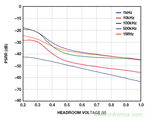 隨著裕量電壓的減小,PSRR 也會減小,壓差可能變得非常大。例如,在 100 kHz 下,裕量電壓從 1 V 變為 500 mV,結果將使PSRR 減少 5 dB。然而,裕量電壓的較小變化,從 500 mV 變為300 mV,結果會導致 PSRR 下降 18 dB 以上。
