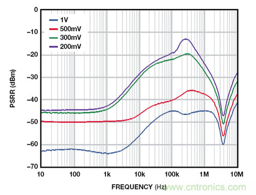 LDO 電源抑製比(PSRR)與裕量電壓相關——裕量電壓指輸入與輸出電壓之差。對於固定裕量電壓,PSRR 隨著負載電流的提高而降低,大負載電流和小裕量電壓條件下尤其如此。圖 1 所示為 ADM7160 超低噪聲、2.5 V 線性調節器在 200 mA 負載電流和 200 mV、300 mV、500 mV 和 1 V 裕量電壓條件下的 PSRR。