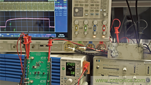 LT3932演示電路(DC2286A)設計為通過一個或兩個LED(作為降壓LED驅動器)驅動1 A的LED電流。如圖1所示,它很容易進行更改和並聯,以實現更高電流、更高電壓或並聯運行。圖4顯示了如何將兩個這樣的電路輕鬆連接在一起,從24 V輸入以10μs、3 A脈衝驅動4個LED。出於測試目的,脈衝發生器可用於提供同步時鍾信號,如圖4所示。在量產機器視覺係統中,可利用時鍾芯片生成同步時鍾信號和PWM脈衝。如需更高電流脈衝,可使用相同的並聯方案添加更多演示電路DC2286A轉換器。