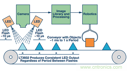 機器視覺係統可以使用並聯LED驅動器來創建自動圖像處理所需的快速、方形、高電流波形。通過並聯轉換器,LT3932 LED驅動器的專有相機閃光燈技術可以擴展到更高的電流。采用並聯LT3932轉換器,即使關斷時間較長,也可以實現3 A和更高的微秒級脈衝。無論LED閃光之間的關斷時間有多長,LED相機閃光波形都能保持方形且無抖動。