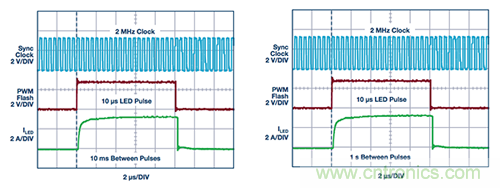 圖2. 無論PWM關斷時間是多少,圖1所示並聯LED驅動器的3 A相機閃光波形看起來相同。波形顯示,(a) 10 ms之後和(b) 1 s之後的10μs脈衝是相同的。經過一天或更長的PWM關斷時間之後,LT3932 LED閃光波形看起來也相同。