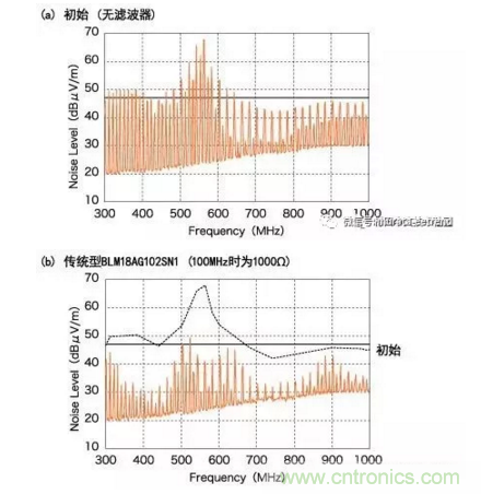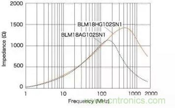 傳統型BLM18AG對300MHz和700MHz之間頻率範圍內的噪聲抑製十分有效。