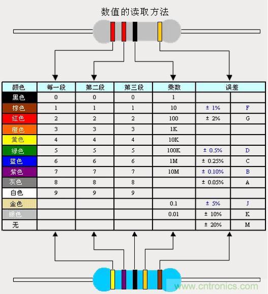 4、色標法:用不同顏色的帶或點在電阻器表麵標出標稱阻值和允許偏差。國外電阻大部分采用色標法。