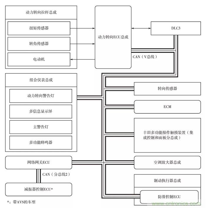 zaifenxifangkuangtulejiexinhaohuodianliuchuanshuguochengshi,yingrenzhenzhakantuzhongdejiantoufangxiang,jiantoufangxiangbiaoshixinhaodechuanshufangxiang。ruguomeiyoujiantoufangxiang,zekegenjufangkuangtudetuxingfuhaolaipanduan。jiantouruguoshishuangxiangde,biaoshixinhaojinengshuruyenengshuchu;方框圖中粗線條表示CAN總線,下圖所示為2016 款皇冠EPS係統方框圖(係統圖)。對方框圖有整體的了解後,應進一步弄清係統(整車或係統)共有幾個框(多少部件),框與框之間存在何種關係,再對照電路原理圖,就可以對電路理解得更為深刻。