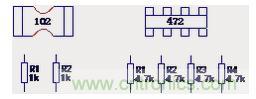 b、用4位數字表示電阻值。前3位為有效值,即千位、百位和個位值,第4位為0的個數。如標注為1501,即為1500Ω;標注為1000,即為100Ω;標注為681,即為680 Ω;標注為1003,即為100kΩ。1Ω以下的值加R表示,同上。
