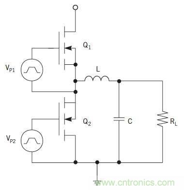 圖1:降壓轉換器拓撲結構使用兩個n溝道MOSFET。Q 1是開關或控製MOSFET,Q 2是同步整流器。L和C包括輸出濾波器,R L是負載電阻。