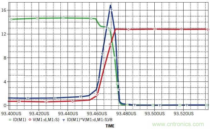 圖2:開關Q 1產生I D(綠色)和V DS(紅色)的特征波形。這兩個波形的乘積給出了瞬時功耗P D(藍色)。