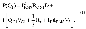 在等式1中,第一項反映了傳導損耗,第二項反映了動態和柵極損耗。I RMS是漏極電流; R ON是溝道電阻; D是占空比; f是開關頻率; t r和t f分別是切換上升和下降時間; 和V S是輸入源電壓。