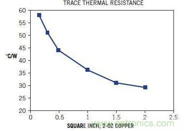圖3:您可以表示2盎司銅印刷電路板走線的熱阻,單位為攝氏度/瓦,與走線麵積的函數關係。這種厚度的銅是大多數印刷電路板的典型特征。