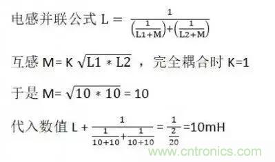 注意 N 有平方的,一組線圈的圈數是N, 則兩組線圈的圈數是 2N,將2N代入到公式中分子有 4N², 也就是說電感量為 4 倍。本例則為 40 mH。