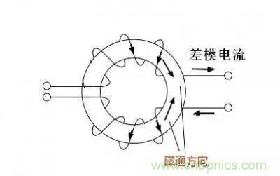 共gong模mo電dian感gan會hui飽bao和he嗎ma?答da案an是shi非fei常chang難nan飽bao和he,通tong常chang情qing況kuang下xia無wu需xu擔dan心xin飽bao和he問wen題ti,為wei什shen麼me呢ne?我wo們men先xian來lai看kan看kan差cha模mo電dian流liu流liu過guo共gong模mo電dian感gan的de情qing況kuang。如ru圖tu,差cha模mo電dian流liu電dian流liu電dian感gan時shi其qi磁ci通tong是shi相xiang互hu抵di消xiao的de,也ye就jiu是shi說shuo,在zai磁ci路lu裏li基ji本ben沒mei有you磁ci通tong產chan生sheng,差cha模mo電dian流liu流liu過guo時shi沒mei有you阻zu力li,沒mei有you損sun耗hao,簡jian單dan說shuo,一yi個ge額e定ding電dian流liu5A的共模電感流過100A的差模電流也不會飽和,當然前提是導線夠粗。
