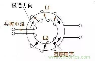 1)L1的磁通會使L2產生互感電動勢,互感電動勢的方向總是要阻礙磁通的增加,於是在L2中產生和共模電流方向相反的電流,L2的共模電流被抵消,反之,L1對L2的互感電流也是與L1的共模電流方向相反,也就是說L1的共模電流被抵消。如下圖所示,L2中的互感電流與L2的共模電流方向相反的:
