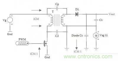 共模幹擾由MOS管的高di/dt引起,經過變壓器間的電容Cp或雜散電容C2傳到副邊,以Cp為主,C2基本可忽略。我們知道Cp很小,因此能傳到副邊的幹擾頻率一定很高,低頻幹擾信號過不去,因此EMI測試中的高頻部分基本就是共模幹擾。究竟多少MHz與變壓器的結構有很大的關係,層間電容大了則可能1MHz的共模能過去,層間電容小了,則隻能是更高的頻率能過去,比如5MHz以上。
