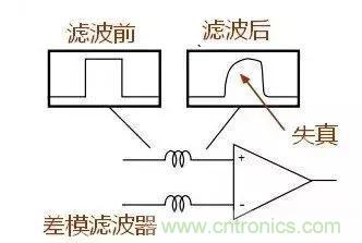 共模濾波器和差模濾波器對差模信號濾波效果對比,差模濾波器在濾出疊加在信號上的噪聲後導致波形失真。