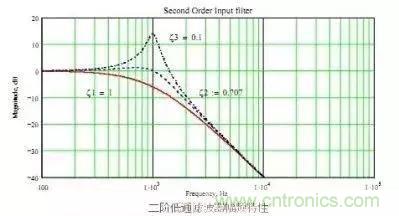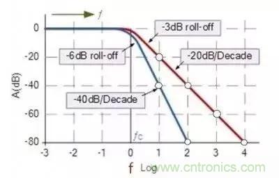 圖中橫坐標是頻率,用對數表示,縱坐標表示增益,單位為dB,注意圖中的圓點處,右麵一條是一階濾波器的衰減曲線,圓點從1 到 2 頻率增加了十倍,從縱坐標中可以看到增益下降了20dB,通常稱為10倍頻程衰減20dB,左麵一條曲線是二階濾波器,不難看出10倍頻程衰減40dB。