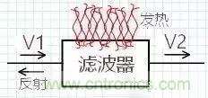 插入濾波後,會有什麼結果?V2 一定小於 V20,也就是說插入濾波器後輸出變小了,為何輸出變小?一部分變成熱量、一部分被濾波器擋住返回了,如圖: