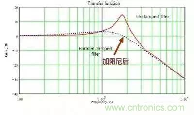 可以看出,截止頻率處的尖峰被壓平,也就是說不再使得噪聲被放大。其中電容 Cd 對阻尼不起作用,隻是為了隔離輸入電壓以避免電阻產生