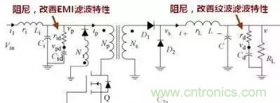 這是一個正激電源,請特別注意,輸入LC的EMI濾(lv)波(bo)器(qi)和(he)輸(shu)出(chu)的(de)紋(wen)波(bo)濾(lv)波(bo)器(qi)都(dou)有(you)一(yi)個(ge)電(dian)容(rong)串(chuan)聯(lian)電(dian)阻(zu)的(de)阻(zu)尼(ni)電(dian)路(lu),阻(zu)尼(ni)作(zuo)用(yong)前(qian)麵(mian)已(yi)多(duo)次(ci)提(ti)及(ji)。特(te)別(bie)注(zhu)意(yi)輸(shu)出(chu)端(duan)的(de)阻(zu)尼(ni)電(dian)路(lu),曾(zeng)經(jing)見(jian)過(guo)帖(tie)子(zi)問(wen)為(wei)何(he)在(zai)電(dian)解(jie)電(dian)容(rong)上(shang)串(chuan)聯(lian)一(yi)個(ge)電(dian)阻(zu),但(dan)似(si)乎(hu)都(dou)沒(mei)有(you)人(ren)知(zhi)道(dao)為(wei)什(shen)麼(me),請(qing)記(ji)住(zhu)這(zhe)是(shi)為(wei)了(le)改(gai)善(shan)紋(wen)波(bo)性(xing)能(neng)加(jia)上(shang)的(de)阻(zu)尼(ni)電(dian)路(lu),有(you)了(le)這(zhe)個(ge)阻(zu)尼(ni)電(dian)路(lu)課(ke)大(da)大(da)改(gai)善(shan)紋(wen)波(bo)性(xing)能(neng)。道(dao)理(li)同(tong)EMI濾波器的阻尼相同。