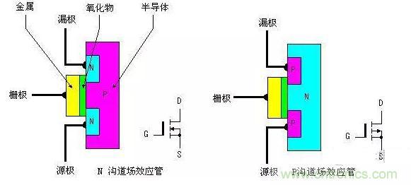功率MOSFET的內部結構和電氣符號如圖所示,它可分為 NPN型和PNP型。NPN型通常稱為N溝道型,PNP型通常稱P溝道型。由圖1可看出,對於N溝道型的場效應管其源極和漏極接在N型半導體上,同樣對於P 溝道的場效應管其源極和漏極則接在P型半導體上。我們知道一般三極管是由輸入的電流控製輸出的電流。但對於場效應管,其輸出電流是由輸入的電壓(或稱場電壓)控製,可以認為輸入電流極小或沒有輸入電流,這使得該器件有很高的輸入阻抗,同時這也是我們稱之為場效應管的原因。