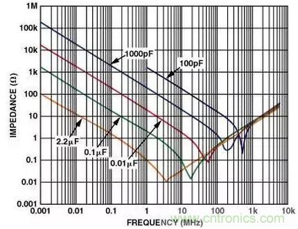 並聯不同的電容值的電容器有助於確保電源引腳在很寬的頻帶上隻能看到很低的交流(AC)阻抗。這對於在運算放大器電源抑製比(PSR)衰減頻率處尤其重要。該電容器有助於補償放大器降低的PSR。在許多十倍頻程範圍內保持低阻抗的接地通路將有助於確保有害的噪聲不能進入運算放大器。圖1示shi出chu了le采cai用yong多duo個ge並bing聯lian電dian容rong器qi的de優you點dian。在zai低di頻pin段duan,大da的de電dian容rong器qi提ti供gong低di阻zu抗kang的de接jie地di通tong路lu。但dan是shi一yi旦dan頻pin率lv達da到dao了le它ta們men自zi身shen的de諧xie振zhen頻pin率lv,電dian容rong器qi的de容rong性xing就jiu會hui減jian弱ruo,並bing且qie逐zhu漸jian呈cheng現xian出chu感gan性xing。這zhe就jiu是shi為wei什shen麼me采cai用yong多duo個ge電dian容rong器qi是shi很hen重zhong要yao的de原yuan因yin:當一個電容器的頻率響應開始下降時,另一個電容器的頻率響應開始其作用,所以能在許多十倍頻程範圍內保持很低的AC阻抗。
