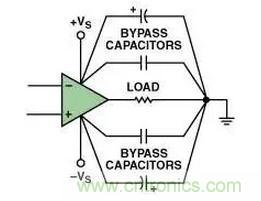 電源端接地:這種方法在大多數情況下都是最有效的,采用多個並聯電容器將運算放大器的電源引腳直接接地。一般說來兩個並聯電容就足夠了——但是增加並聯電容器可能給某些電路帶來益處。