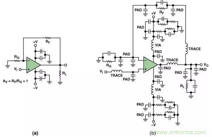 所謂寄生效應就是那些溜進你的PCB並在電路中大施破壞、頭痛令人、原因不明的小故障(按照字麵意思)。它們就是滲入高速電路中隱藏的寄生電容和寄生電感。其中包括由封裝引腳和印製線過長形成的寄生電感;焊盤到地、焊盤到電源平麵和焊盤到印製線之間形成的寄生電容;通孔之間的相互影響,以及許多其它可能的寄生效應。圖3(a)示出了一個典型的同相運算放大器原理圖。但是,如果考慮寄生效應的話,同樣的電路可能會變成圖3(b)那樣。