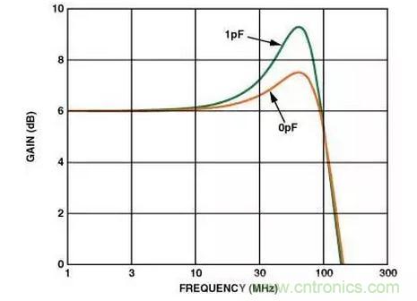 在高速電路中,很小的值就會影響電路的性能。有時候幾十個皮法(pF)的電容就足夠了。相關實例:如果在反相輸入端僅有1 pF的附加寄生電容,它在頻率域可以引起差不多2 dB的尖脈衝(見圖4)。如果寄生電容足夠大的話,它會引起電路的不穩定和振蕩。