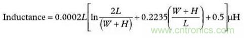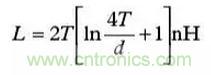帶狀電感是另外一種需要考慮的寄生效應,它是由於印製線過長或缺乏接地平麵引起的。式(2)示出了計算印製線電感(Inductance)的公式。參見圖6。