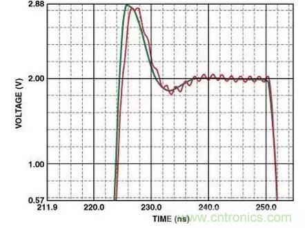 圖7中的振蕩示出了高速運算放大器同相輸入端長度為2.54 cm的印製線的影響。其等效寄生電感為29 nH(10-9H),足以造成持續的低壓振蕩,會持續到整個瞬態響應周期。圖7還示出了如何利用接地平麵來減小寄生電感的影響。
