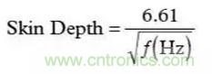 在高頻段,必須考慮一種稱為“趨膚效應”的現象。趨膚效應會引起電流流向導線的外表麵——結果會使得導線的橫截麵變窄,因此使直流(DC)電阻增大。雖然趨膚效應超出了本文討論的範圍,這裏還是給出銅線中趨膚深度(Skin Depth)的一個很好的近似公式(以cm為單位):