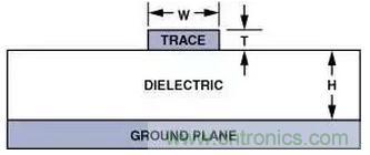 (6)H表示從接地平麵到信號印製線之間的距離,W表示印製線寬度,T表示印製線厚度;全部尺寸均以密耳(mils)(10-3英寸)為單位。εr表示PCB材料的介電常數。