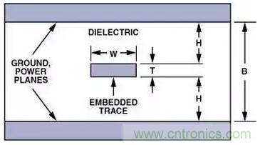 帶狀控製阻抗印製線(參見圖14)采用了兩層接地平麵,信號印製線夾在其中。這種方法使用了較多的印製線,需要的PCB層數更多,對電介質厚度變化敏感,而且成本更高——所以通常隻用於要求嚴格的應用中。