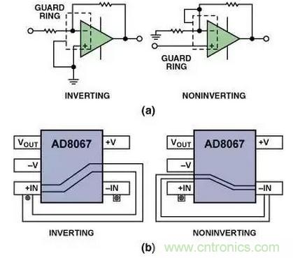 圖15(a)示出了用於運算放大器反相配置和同相配置中的保護環的原理圖。圖15(b)示出用於SOT-23-5封裝中兩種保護環的典型布線方法。