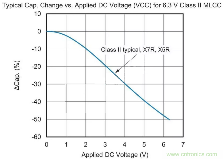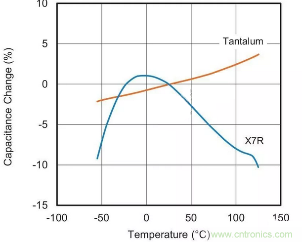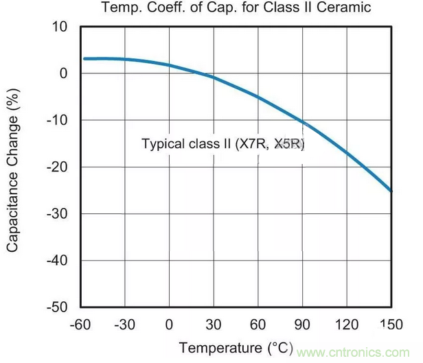 用於替換最可能的MLCC候選者采用“II類”電介質材料。這種II類陶瓷(通常為X7R或X5R)的容值會在溫度範圍內變化,這種特征稱為電容溫度係數(TCC),參見圖1。
