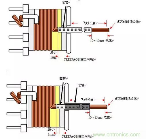 ④變壓器中有加鐵氟龍套且有折回線時,其出入線所加之鐵氟龍套管須與 骨架的凹槽口齊平(或至少達2/3高),並自骨架的凹槽出線以防止因套管過長造成拉力將線扯斷。但若為L形引腳水平方向纏線,則套管應與 骨架邊齊平(或至少2/3長),如圖7所示。